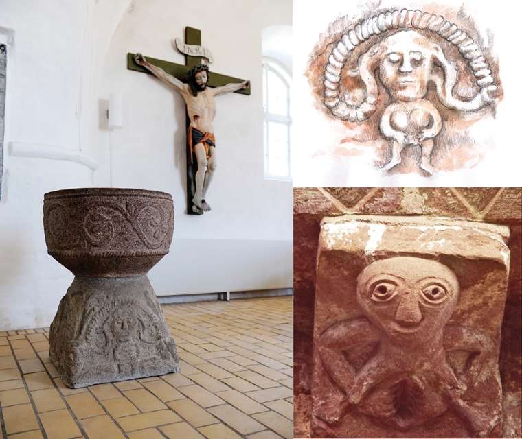 Det er derfor slet ikke underligt, at en Sheela-na-gig kan have fundet vej til en gammel døbefont på Fyn. Muligvis stammer fonten fra 1100-tallet, hvor en keltisk inspireret billedhugger fik til opgave at lave den. Men det kan også være, at fontens sokkel – hvorpå kvindefiguren ses – i virkeligheden er ældre end kirken, og at den oprindelig blev brugt i et kulthus af en eller anden slags. Sheela-na-gig-figuren er nemlig ældgammel. Efter al sandsynlighed er hun den selv samme Moder jord-gudinde, som i de tidlige kulturer var af kolossal betydning for kulten og det religiøse liv. Hun var en af de store, gamle guder, som de kristne præster havde svært ved at aflive. Derfor kom hun med på kirkemuren – men ofte i en perverteret udgave. Menigheden skulle lære at opfatte hende som en heks, en gal hore, som man måtte væmmes ved.